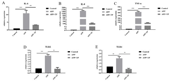 TP influenced the mRNA level of TLR2 and TLR4 in NPTr cells infected by APP. As shown in Figure 2D,E, the secretion of TLR2 and TLR4 in NPTr cells stimulated by APP was significantly than in the control groups. However, the secretion of TLR2 and TLR4 in cells pretreated with TP was significantly lower than in cells treated with APP alone (Figure 2D,E). These results suggest that TP could inhibit the secretion of TLR2 and TLR4 in NPTr cells infected by APP.