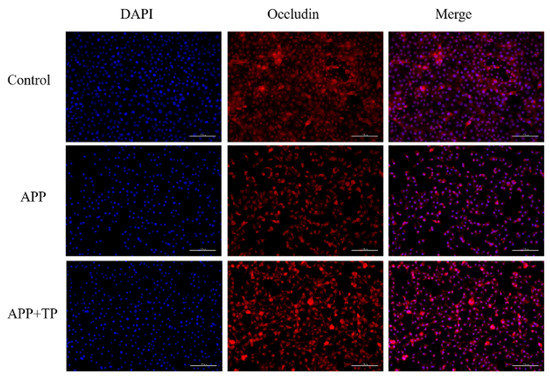The effect of TP on the integrity of the epithelial barriers infected by APP was further evidenced by the β-catenin and occluding levels of the two important TJ and AJ proteins. The localization of immunofluorescence of ß-catenin and occluding was observed by microscope. As shown in Figure 3, there was a destructive effect on the NPTr cell TJs infected by APP when compared with the control cells, and β-catenin and occludin expression was downregulated. However, when NPTr cells were pretreated with TP, the downregulation of these expressions was inhibited. This result was confirmed by immunoblotting. As shown in Figure 4B, protein expression levels of β-catenin and occludin were significantly decreased post-infection by APP in contrast to those of uninfected control cells. Following pretreatment of NPTr cells with TP, the protein expression levels of β-catenin and occludin were higher than those in untreated cells stimulated by APP. These results showed that pretreatment of cells with TP can inhibit the destruction of the β-catenin and occludin proteins, respectively, by APP.