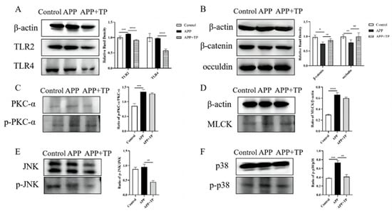 (A,B): The protein levels of TLR2, TLR4, ß-catenin, and occludin in NPTr cells and TP pretreatment cells infection with APP. GAPDH in whole cell lysates was detected as the loading control. (C): the ratio of p-PKC-α/PKC-α, (D): the ratio of MLCK: Effects of TP on PKC and MLCK pathways in NPTrs activated by APP. (E): the ratio of p-JNK/JNK, (F): the ratio of p-p38/p38: Effect of TP on phospho-JNK, and -p38 and total -JNK, and -p38 expression in NPTrs by Western blotting. (mean ± SD, n = 3).* p < 0.05, ** p < 0.01, *** p < 0.001, **** p < 0.0001.