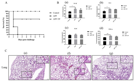 (A): Survival curves for mice in infection experiment. (B): Secretion of IL-1ß, IL-6, IL-8, and TNF-α in the serum of mice infected with APP, as measured by ELISA. * p < 0.05, *** p < 0.001. (a): IL-1β production in serum of APP-infected mice affected by TP. (b): IL-6 production in serum of APP-infected mice affected by TP. (c): IL-8 production in serum of APP-infected mice affected by TP. (d): TNF-α production in serum of APP-infected mice afected by TP. (C): Histopathology of representative lung tissues from BALB/c mice and TP pretreatment mice infected with APP. (e): control group. (f): mice with APP infection group. (g): mice administered with TP. The black band at the bottom left of each picture indicates the scale bar (200 μm).