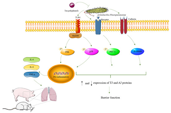 Tea is a popular beverage consumed worldwide. It is made from the leaves of the plant Camellia sinensis, which originated in ancient China [1,2]. Tea polyphenols (TP) are a specific bioactive ingredient of tea, and have various health promoting properties [3], including antioxidant, antimutagenic, immuno-regulatory, hypocholesterolemic, antibacterial, and anticancer activities [4,5]. If TP reach sufficient concentrations after drinking tea for a long time, they are absorbed and retained and exert their desired effects in plasma and tissues [1]. Supplementation with TP mainly alters the gut microbiome composition and can benefit bone health [6], which can control obesity and related metabolic disorders [3,7]. TP have protective effects on high glucose-induced cell proliferation and senescence in human glomerular mesangial cells (HGMCs) [8]. In addition, several studies have shown that natural polyphenols not only have antibacterial effects, but also show low toxicity and great bioavailability [9,10]. TP show great promise as antibiotic alternatives with good antibacterial effects. Previous studies have shown that TP can lower the secretion of pro-inflammatory cytokines and reduce the inflammatory response to Fusobacterium nucleatum [11], inhibit the virulence of Pseudomonas aeruginosa [12], and protect against Haemophilus parasuis challenge [13]. However, the effects of TP on Actinobacillus pleuropneumoniae infection are not completely understood.