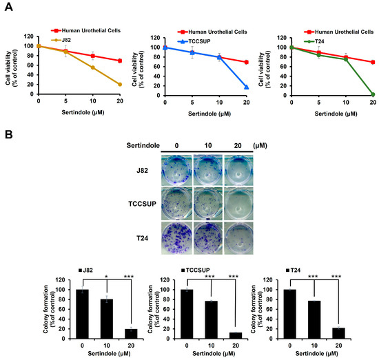 To probe sertindole’s anti-bladder cancer potential, we first conducted MTS assays to evaluate whether sertindole induced in vitro cytotoxicity against a panel of human urinary bladder transitional cell carcinoma (TCC) cell lines, including J82, TCCSUP, and T24. As shown in Figure 1A, sertindole dose-dependently reduced TCC cell viability, with an IC50 of 11.43 ± 0.63 μM, 13.43 ± 0.89 μM, 14.79 ± 0.95 μM for J82, TCCSUP, and T24, respectively, upon sertindole treatment for 48 h. In contrast, 48 h treatment with sertindole barely slayed normal human urothelial cells, even at a dosage as high as 20 μM (Figure 1A), arguing that sertindole-induced cytotoxicity was selective against malignant bladder epithelial cells. Furthermore, we performed clonogenicity assays to examine sertindole’s effect on the long-term proliferation of TCC cells. It is noted that sertindole suppressed the colony-forming capacity of all tested TCC cell lines in a dose-dependent manner. Particularly, sertindole at 20 μM dropped the colony-formation levels of J82, TCCSUP, T24 and to 19.58 ± 3.97% (p < 0.001), 12.24 ± 0.68% (p < 0.001), and 21.92 ± 2.28% (p < 0.001) compared with their respective drug-free controls (Figure 1B).
