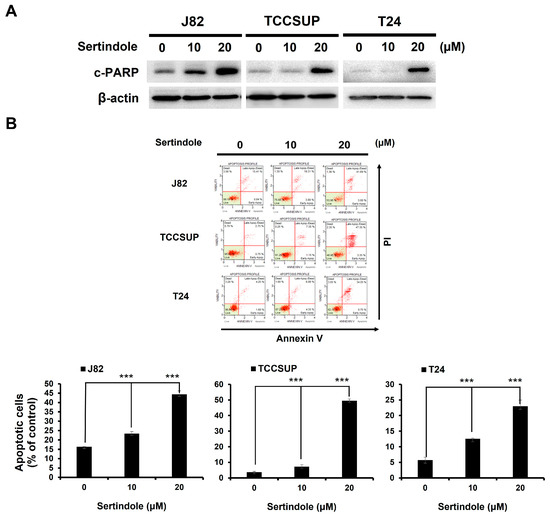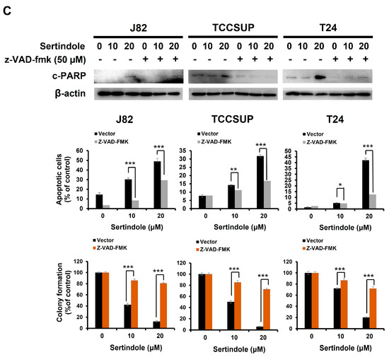 The nature of sertindole-induced bladder cancer cytotoxicity was addressed. In all sertindole-treated bladder TCC cell lines, we observed a marked increase in the levels of the cleaved form of poly (ADP-ribose) polymerase (c-PARP), a canonical biochemical hallmark of apoptosis [32] (Figure 2A). Additionally, sertindole-elicited apoptosis was substantiated by the cell-surface exposure of phosphatidylserine, another well-established apoptosis marker, as evidenced by the elevation in the levels of cells bound by Annexin V (Figure 2B). We next investigated the role of apoptosis induction in sertindole-elicited bladder cancer cytotoxicity. To this end, human bladder TCC cell lines were pre-treated with the pan-caspase inhibitor z-VAD-fmk to block the initiation of apoptosis, followed by 24 h-treatment with sertindole and then subjected to Annexin V/propidium iodide dual staining assays and clonogenicity assays. Notably, both sertindole-evoked apoptosis induction and clonogenicity inhibition in human bladder TCC cells were dramatically abolished by pre-treatment with z-VAD-fmk. In particular, z-VAD-fmk pre-treatment lowered the levels of apoptotic populations from 48.88 ± 3.18% to 29.46 ± 2.33% (p < 0.001), 31.83 ± 0.98% to 16.18 ± 1.13% (p < 0.001), and 42.14 ± 1.87% to 12.67 ± 1.99% (p < 0.001) in J82, TCCSUP, and T24 cells treated with 20 μM of sertindole, respectively (Figure 2C).
