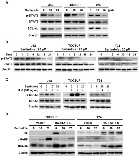 Considering apoptosis is indispensable to sertindole’s cytotoxic action, we then asked how sertindole provokes apoptosis in human bladder TCC cells. Given STAT3’s well-established prosurvival action and fundamental role in promoting bladder cancer genesis and progression [20], we examined sertindole’s effect on STAT3 activity in bladder TCC cells. It is noteworthy that, in all sertindole-treated TCC cell lines, the levels of tyrosine 705-phosphorylated STAT3 (p-STAT3) were lessened dose-dependently, along with a paralleled decrease in the expression levels of BCL-xL, an antiapoptotic protein and a well-established STAT3′s transcriptional target (Figure 3A, top panel). Kinetic analyses further indicated a marked decline in p-STAT3 levels after 12 h-treatment with sertindole (Figure 3A, top panel). To further prove sertindole as an inhibitor of the STAT3 signaling, we evaluated sertindole’s effect on interleukin 6 (IL-6)-induced STAT3 activation. As expected, IL-6 (100 ng/mL) stimulated a marked increase in p-STAT3 levels in all TCC cell lines, whereas sertindole co-treatment abrogated IL-6-upregulated p-STAT3 (Figure 3B).
