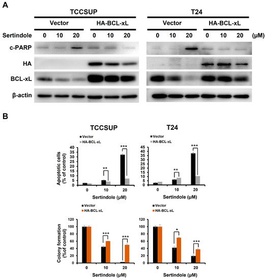 It is well-established that the expression of BCL-xL, a potent antiapoptotic member of the BCL-2 protein family, is transcriptionally controlled by STAT3 [34]. Along this line, we observed a marked BCL-xL downregulation along with a decrease in p-STAT3 levels in all sertindole-treated cell lines; in contrast, BCL-xL levels were rescued from sertindole-induced downregulation in cells with ectopic STAT3-C expression (Figure 3C). We further evaluated if BCL-xL downregulation accounted for sertindole’s proapoptotic action on human bladder TCC cells by testing the extent of sertindole-evoked apoptosis in cells without or with stable expression of BCL-xL. As shown in Figure 4A, sertindole downregulated BCL-xL but also triggered apoptosis in TCCSUP and T24 control clones, as evidenced by the elevation in the levels of c-PARP and Annexin V-positive cell populations. Conversely, sertindole-induced apoptosis was impaired in BCL-xL stable clones (Figure 4A), further leading to the rescue of colony-forming capacity (Figure 4B).