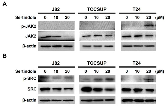 With the event downstream of STAT3 blockage by sertindole elucidated, we then focused on the event upstream of STAT3 to explore how sertindole blocks STAT3 activation. It is well-recognized that STAT3 can be activated via tyrosine 705 phosphorylation by upstream non-receptor tyrosine kinases Janus kinase (JAK) or SRC in response to stimulation with cytokines or growth factors [35]. Because of that, we tested whether sertindole blocks STAT3 activation by repressing JAK or SRC. As shown in Figure 5A, it seems that sertindole induced JAK2 activation in T24 cells, as revealed by an increase in the levels of JAK2 with dual phosphorylation at tyrosine residues 1007 and 1008 (p-JAK2), while no immunoblot signal of p-JAK2 was detected in sertindole-treated J82 and TCCSUP cells. As to sertindole’s effect on SRC, it appeared that sertindole promoted SRC activation in all tested bladder TCC cell lines, as judged by the upregulation of the active SRC (i.e., tyrosine 406-phosphorylated SRC (p-SRC)) after sertindole treatment (Figure 5B).