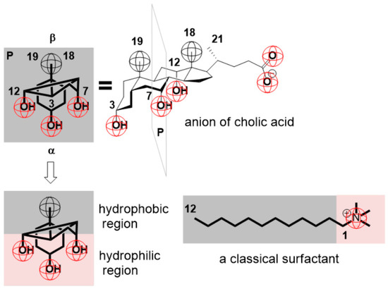 According to Small, bile salts are biologically the most important detergent-like molecules [1]. Bile acid anions, similar to classic surfactants with a hydrophobic hydrocarbon chain (tail) and a polar head, in terms of hydrophobicity, have two regions (Figure 1): a more hydrophobic convex surface (β-side of the steroid skeleton) and a less hydrophobic (i.e., hydrophilic) concave surface (α-side of the steroid skeleton) [1,2,3,4,5,6,7,8,9,10] (Appendix A). Regarding bile acids, cholic acid is the most complete separation of the hydrophobic and hydrophilic surfaces. Namely, C7 and C12 OH groups are α-axial, while the C3 OH group has an α-pseudoaxial configuration [11]. From this, all three OH groups are localized on the concave surface of the steroid skeleton—planar polarity (Figure 1) [3,4,10,11,12,13,14]. By changing the orientation of the OH group from α-axial to α-equatorial or β-equatorial, the hydrophobicity of the convex surface of the steroid skeleton is reduced, which is reflected in the property of bile acid anions, for example, in an aqueous solution, to have a tendency towards a reduction in the self-association of bile salts. It is similar when an α-axial OH group is oxidized to an oxo group—the hydrophobic surface on the β-side of the steroid skeleton decreases [4,5,7,11] (Appendix A).