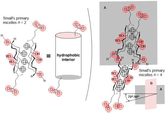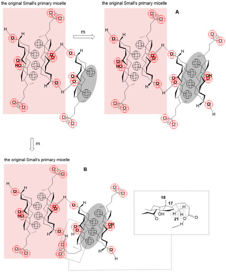 Small proposed the concept of the formation of primary and secondary micelles [1]. Bile acid anions in primary micelles occupy such a position that their hydrophobic sides are opposite (back-to-back association)—the concept of hydrophobic association. At the same time, the polar groups are oriented towards the water environment (Figure 2) [1,6,9]. Evidence of the formation of primary micelles comes from 1H NMR experiments, namely for bile acid salts above the critical micellar concentration (CMC); when primary micelles are formed, there is a broadening of the line (in the NMR spectrum) of C18 and C19 methyl groups from the hydrophobic side of the steroid skeleton [28,29]. About 10 (aggregation number) bile acid anions can be packed into the primary micelles without creating a cavity [1]. Gouin and Zhu concluded that Small’s dimmer micelle plays a crucial role in the self-association mechanism of bile salts. Dimeric micelles can be detected below the CMC value [30]. In Kawamura’s micelle model (which corresponds to Small’s primary micelles with a higher aggregation number ≈ 10), bile acid anions are arranged on the surface of the roller coating so that the angular methyl groups are oriented toward the interior of the geometric body. In contrast, OH groups are oriented toward the aqueous phase. The side chains with carboxylate groups are located on the bases of the roller, where each carboxylate group with the carboxylate group of the adjacent monomer is trans-oriented. In this way, the electrostatic repulsion in the aggregate is reduced [31].