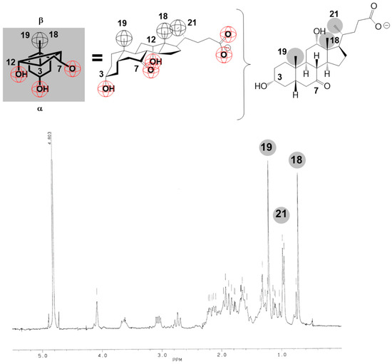 The molecular and conformational formula of the anion of 7-oxodeoxycholic acid and the 1H NMR spectrum of Na-7-oxodeoxycholate in D2O (35 mM), the methyl groups whose H atoms are determined by the spin–relaxation times are marked (293.1 ± 0.2 K).