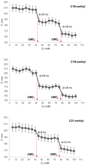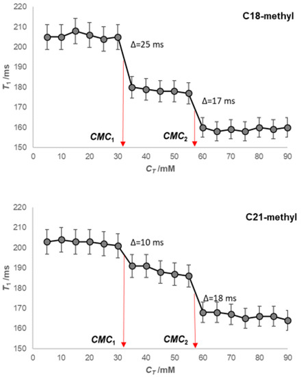 Functions of the spin–lattice relaxation time (Appendix C) on the total concentration of Na-7-oxodeoxycholate (T1 = f(CT)) for the hydrogen atoms from the three methyl groups (C18, C19, and C21) of the examined bile salt (Figure 3) contains two steps (i.e., a sudden decrease in the spin–lattice relaxation times), which means that two critical micellar concentrations can be defined in the area of the studied concentrations (Figure 4).