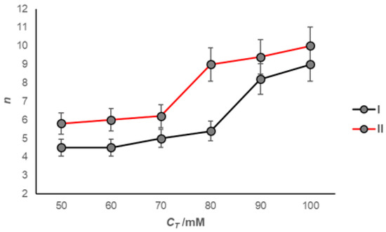 For the existence of two separate steps (jumps) on the function T1 = f(CT), direct association of primary micelles with H-bonds is thermodynamically not possible (as well as for stereochemical reasons). The formation of secondary micelles takes place via two main processes. Process I corresponds to the association of monomers through H-bonds for primary micelles—a thermodynamically unfavorable process (, with the newly associated monomer, the convex hydrophobic surface is exposed to hydration); in process II, the aggregate from process I, through the hydrophobic effect, binds a new monomer, thus forming a secondary micelle—a thermodynamically favorable process. At relatively low concentrations of monomers (around CMC1), the equilibrium concentration of aggregate is low, which then decouples the processes of formation of primary and secondary micelles. As the anions of 7-oxodeoxycholic acid form micelles with a relatively small aggregation number, the law of mass action applies to their association. So, with the increase in the total concentration of surfactants, the concentration of monomers also increases. According to Le Chatelier’s principle, this shifts the balance of association (5) to the right, and, therefore, aggregates of the type are extracted from process of association (3)—coupling of the formation of primary and secondary micelles due to the increase in monomer concentration.