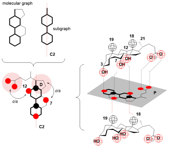 In the molecular graph of the steroid skeleton, the C7 OH group is in the cis position with the conformationally rigid D ring, while the C12 OH group is also in the cis position with the conformationally flexible C17 side chain; the second-order symmetry axis of the largest longitudinal subgraph of the steroid skeleton is a geometric element for determining the relative cis–trans relationship (P = plane of projection).