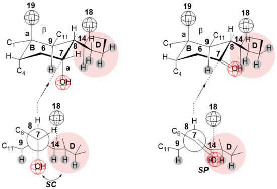 Conformational analysis of the environment of C7 α-axial and C7 oxo groups using Newman’s projection formulas (sc—synclinal and sp—sinperiplanar).