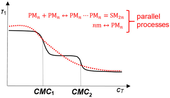 However, if a direct reaction of the formation of secondary micelles (2) were to occur from the primary micelles, then, even at the first critical micellar concentration, the secondary micelles would be formed in addition to the primary micelles (the law of mass action: i.e., the formation of secondary micelles would proceed parallel to the formation of primary micelles). In this case, on the function T1 = f(CT) of the anion of 7-oxodeoxycholic acid, two sharp decreases in the spin–lattice relaxation time would merge into one extended change in T1 (Figure 9).