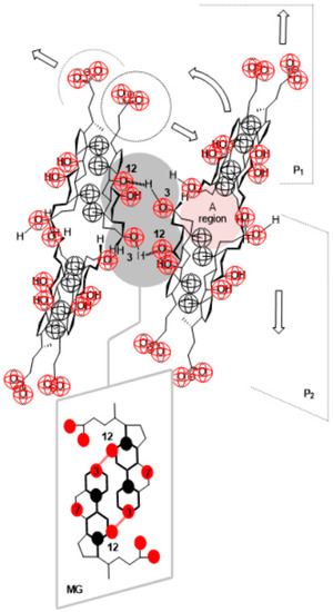 In the case of primary micelles of bile acid anions, if the aggregation number is greater than three, for steric (conformational) reasons, the association of two primary micelles by hydrogen bonds between the concave surfaces of steroid skeletons is complex. Two hydrogen bonds can be formed relatively easily; the first H-bond is between the C3 α-pseudoaxial OH group of the micellar building unit from the first primary micelle and the C12 α-axial OH group of the micellar building unit from the second primary micelle. The second H-bond is between the C12 α-axial OH group of the micellar building unit from the first primary micelle and the C3 α-pseudoaxial OH group of the micellar building unit from the second primary micelle (MG, Figure 10).