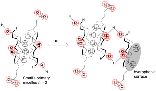 According to Small’s concept, during the formation of secondary micelles of bile acid anions (), two primary micelles (; equal in aggregation number, n) are connected by hydrogen bonds [1,28]: