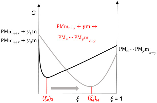 when the concentration of the monomer (i.e., the anion of 7-oxodeoxycholic acid) is . With an increase in the total concentration of surfactant (7-oxo deoxycholate) according to the law of mass action for the reaction of primary micelle formation, the concentration of monomers and the concentration of primary micelles (i.e., the population of primary micelles with different aggregation numbers) simultaneously increase. According to phase separation theory, only the primary micelle concentration would increase, while the monomer concentration would remain unchanged. As the monomer concentration increases (), the affinity of the association reaction (5) changes. The Gibbs free energy of the system is the sum of the product of the chemical potential () and the amount of the corresponding particle (): . Therefore, the function also changes with the change in the concentration of monomers and primary micelles (Figure 14). According to Le Chatelier’s principle [67,68,69], the new equilibrium state () in the association reaction is as follows:
