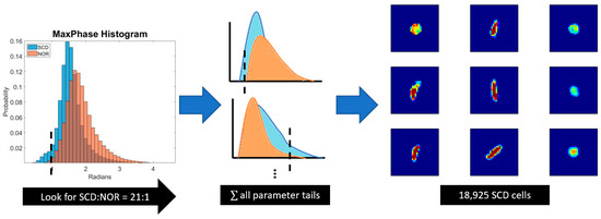 Figure 5). As an example, 0.8118 radians is the threshold calculated for the maximum phase histograms. For every 21 sickle cells that are below this maximum phase threshold, only 1 healthy cell will exist in the same regime. Several of the morphological parameters, including max phase, standard deviation of phase, top 25% optical path length, max phase gradient, eccentricity and elongation ratio all had tail distributions that satisfied the search criterion. These tail subsets are grouped together, and the union of the sets yielded 18,925 SCD cell images for training. Another 18,925 normal cell images were randomly selected from Sample 4 and Sample 5 to add to the training set. Test datasets consist of all archived data shown in