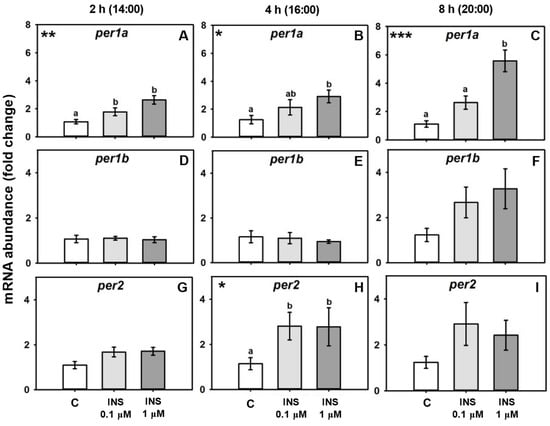 Dose–response effects of insulin treatment on per gene mRNA abundance. Relative mRNA abundance of the clock genes per1a, per1b, and per2 in cultured goldfish livers treated with different concentrations of insulin for 2 h (A,D,G), 4 h (B,E,H), or 8 h (C,F,I). Data are shown as mean ± SEM; n = 8. Data were analyzed by one-way ANOVA (* p < 0.05; ** p < 0.005; *** p < 0.001). Significant differences among groups according to SNK test are represented by different letters.