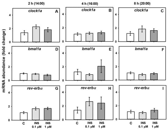 In mammals, some reports suggest that insulin downregulates rev-erbα expression [,,], whereas no effect was observed in goldfish. This could represent another potential difference in the circadian response to insulin between mammals and teleosts, which should be further investigated. The mRNA abundance of clock1a and bmal1a genes was not significantly affected by insulin treatment either. However, we cannot discard that insulin could act on other important clock genes in different models.