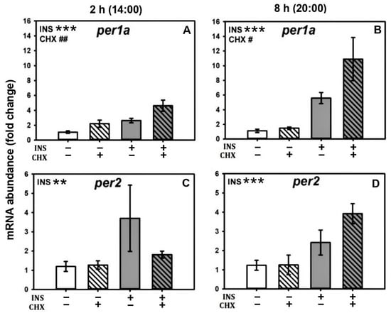 Effects of cycloheximide on insulin action over per mRNA abundance. Relative mRNA abundance of clock genes per1a and per2 in cultured goldfish liver treated with 1 µM insulin or 10 µM cycloheximide alone or both drugs together for 2 h (A,C) or 8 h (B,D). Data are shown as mean ± SEM; n = 8. Data were analyzed by two-way ANOVA. INS = insulin. CHX = cycloheximide; ** p < 0.005 INS; *** p < 0.001 INS. # p < 0.05 CHX; ## p < 0.005 CHX.