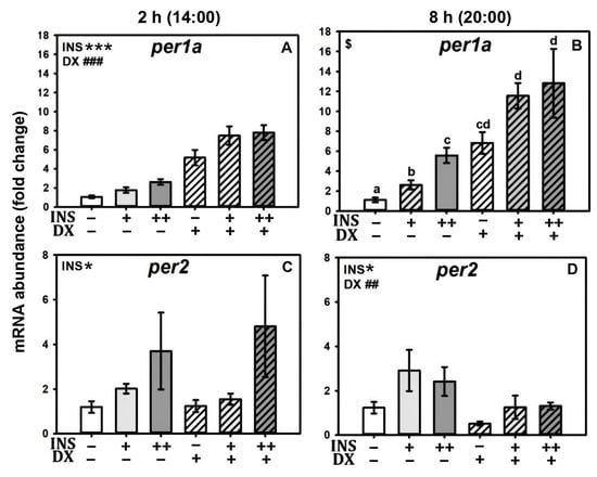 Effects of dexamethasone on insulin action over per mRNA abundance. Relative mRNA abundance of clock genes per1a and per2 in cultured goldfish liver, treated with 0.1 µM insulin (+), 1 µM insulin (++), and 0.1 µM dexamethasone alone or both drugs together for 2 h (A,C) or 8 h (B,D). Data are shown as mean ± SEM; n = 8. Data were analyzed by two-way ANOVA. When an interaction between factors occurred, a one-way ANOVA followed by a SNK test was performed, and differences among groups were represented by different letters (B). INS = insulin. DX = dexamethasone. * p < 0.05 INS; *** p < 0.001 INS. ## p < 0.005 DX; ### p < 0.001 DX. $ interaction between drugs (p < 0.05).
