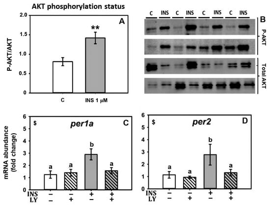 Involvement of PI3K/AKT pathway in insulin action on clock gene mRNA abundance. Western blot analysis of the phosphorylation status of AKT protein in cultured liver of goldfish after 4 h of treatment with control medium (C) or 1 µM insulin (INS). The graph (A) represents the p-AKT/AKT ratio from Western blots performed on 8 individual samples per treatment (mean ± SEM); and (B) shows representative blots. ** indicates significant differences (p < 0.005) between the groups according to Student’s t-test. (C,D) Effect of the PI3K/Akt pathway inhibitor LY294002 on insulin action over per1a and per2 mRNA abundance (mean ± SEM; n = 8). Data were analyzed by two-way ANOVA. When an interaction between factors occurred, a one-way ANOVA followed by a SNK test was performed, and differences among groups were represented by different letters. INS = insulin. LY = LY294002. $ interaction between factors (p < 0.05).