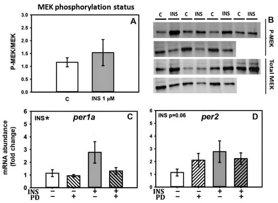 Regarding the MEK pathway, there was no changes in MEK phosphorylation status after a 4 h treatment with 1 µM insulin based on the absence of changes in the p-MEK/MEK ratio (Figure 6A,B). In agreement, the inhibitor of the MEK pathway PD98059 did not interfere in the induction of per1a and per2 by insulin treatment (Figure 6C,D).