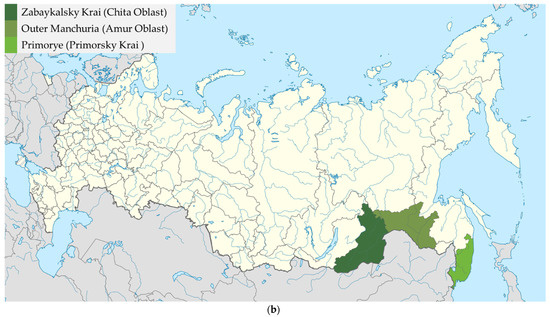 The use of medicinal plants in the form of decoctions, infusions, etc., with low toxicity and minor side effects, is an alternative method of eliminating H. pylori [4,26,27]. Today, the roots of Scutellaria baicalensis [28] are used a Chinese traditional medicinal plant with a high therapeutic potential; they are used to treat gastritis, diarrhea, hepatitis, atherosclerosis, diabetes mellitus, hypertension, eye diseases, vomiting, hemorrhages, insomnia, colds, respiratory infections, etc. [29,30,31,32,33]. In Russia, the plant is distributed in the territories of Zabaykalsky Krai, the Outer Manchuria and southwestern Primorye [34], Figure 1. Its potential is achievable due to the content of secondary metabolites in the plant flavonoids, which are able to protect the body from oxidative stress, showing antimicrobial activity [35]. The main flavonoid of Scutellaria baicalensis is baicalin (its concentration in the roots of the plant reaches from 8.1% to 15.6% [30,31]).