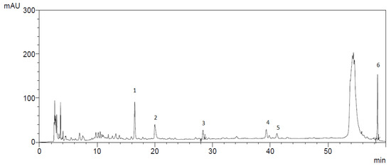 Chromatogram showing the content of BAS in the extract of Scutellaria baicalensis: 1—3,4- Dihydroxycinnamic acid; 2—luteolin; 3—rutin; 4—scutellarin; 5—chrysin; 6—baicalin.