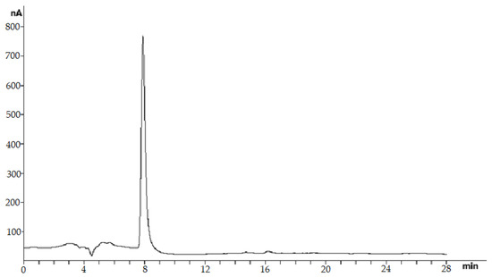 Column chromatography was used to determine the quantitative content of polyphenols in the plant extract. A chromatographic column (LC-20 Prominence, Shimadzu, Kyoto, Japan) was filled with a modified sorbent with octadodecyl and terminal aminophenol groups. Polyphenols were eluted with a mixture of water–acetonitrile, 0.1% tributylamine 85:15 was used as an eluent. The elution was carried out in isocratic mode, the flow rate was 1 mL/min, the elution time was 55 min. Detection was performed using a fluorescent detector, the excitation wavelength was 350 nm, the detection wavelength was 415 nm, the collection of individual substances was carried out automatically using a fraction collector [54].