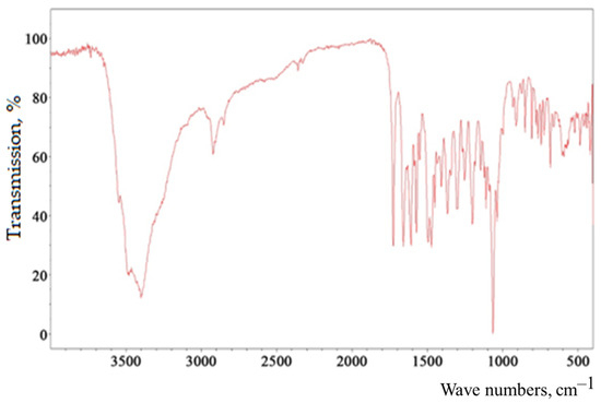 The infrared spectrum (Figure 4) of baicalin (5,6-dihydroxy-4-hydroxy-2-phenyl-4H-1-benzopyran-7-β-D-glucuronide) is characterized by the following features. The band with the absorption maximum at 3398 cm−1 is characteristic of the associated OH groups [49,50,51]. Bands at 2922 and 2853 cm−1 are found, due to the symmetric and antisymmetric stretching vibrations of the tertiary carbon in the carbohydrate fragment. The presence of C=O in the carboxyl group is characterized by a band at 1725 cm−1. The bands at 1657 and 1607 cm–1 are due to C=O stretching vibrations, as well as the influence of OH groups in positions three and five of the heterocyclic fragment of the molecule due to the formation of an intramolecular hydrogen bond with C=O. It is the influence of this hydroxyl that causes distortion of the planar arrangement of the pyran fragment and the bond, and thus leads to the appearance of a resonance in the form of a doublet. In turn, OH at the third carbon atom of the unsaturated pyran fragment (ring C) causes a weak band at 1550 cm−1. Stretching vibrations of C- bonds in aromatic systems of rings A and B cause bands at 1571, 1496, and 1462 cm−1. The OH group at the tertiary carbon is responsible for the 1408 cm−1 band. The bands at 1364 and 1304 cm−1 appear as a result of O-H in-plane deformation vibrations in the structural components of baicalin. The bands at 1254, 1200, and 1147 cm−1 are caused by two interacting antisymmetric vibrations C-O-C and C-C-O in the structures of heterocycles (ring C and carbohydrate fragment). Symmetrical C-O-C and C-C-O stretching vibrations cause bands at 1107 and 1064 cm−1 of the carbohydrate fragment. The 910 cm−1 band is specific to the pyranose ring. A relatively weak band at 849 cm−1 indicates out-of-plane C2-H bending vibrations, thus characterizing the α-anomer with the equatorial arrangement of unsubstituted hydrogen atoms of the B–C ring bond. The trisubstituted ring A is characterized by bands at 788, 764, and 745 cm−1 due to deformation out-of-plane and in-plane C-H vibrations. The monosubstituted ring B is characterized by the presence of an out-of-plane bending vibration of the C-C bond at 726 cm−1.