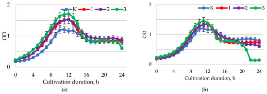 At the incomplete stage of observation (up to 18 h), no statistically significant differences were found between the samples (p > 0.05). Neither the concentration of baicalin nor the pH of the medium had a significant effect on the test culture. For most modes of the cultivation of microorganisms in 18 h, significant differences were observed for the dying phase in comparison with the control sample, there were smaller dynamics of population decrease than in the control. The phase of the highest concentration of microorganisms in the medium with the addition of baicalin exceeded from 1 to 3 h compared with that without it. Significant stimulation of L. brevis was not observed; the concentration and time of biomass accumulation were approximately the same as without the addition of baicalin, but the concentration stabilization phase lasted longer than the control, 1 up to 3 h (baicalin concentration 1.0 mg/mL, pH 1.5–2.0), which may positively affect the preservation of the quality characteristics of the product during storage and increase the shelf life.