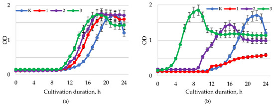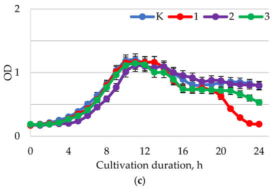 Dynamics of the optical density (λ = 600 nm) of the bacterial suspension of B. longum with different values of active acidity pH: (a) 1.5–2.0; (b) 5.5–6.0; (c) 7.5–8.0 with different concentrations of baicalin: K—control (0.00 mg/mL); 1—(0.25 mg/mL); 2—(0.50 mg/mL); 3—(1.00 mg/mL).