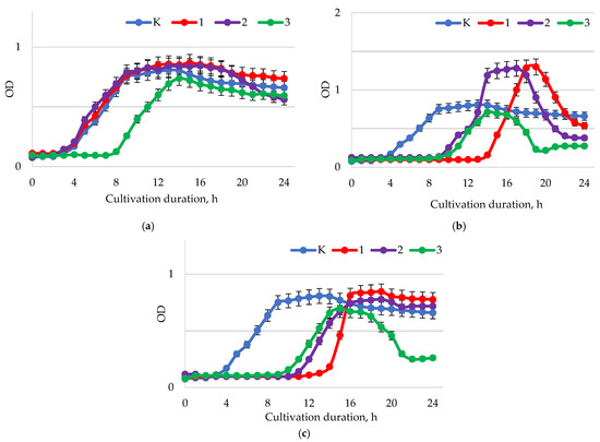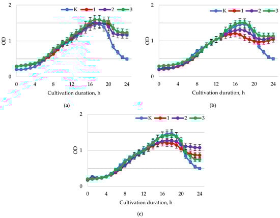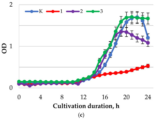 Dynamics of the optical density (λ = 600 nm) of the bacterial suspension of L. casei with different values of active acidity pH: (a) 1.5–2.0; (b) 5.5–6.0; (c) 7.5–8.0 with different concentrations of baicalin: K—control (0.00 mg/mL); 1—(0.25 mg/mL); 2—(0.50 mg/mL); 3—(1.00 mg/mL).