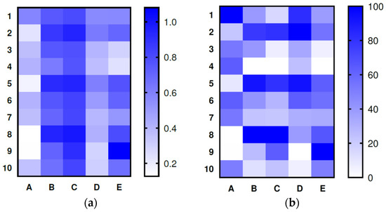 Heat maps of (a) absolute and (b) normalized mean optical density values of bacterial suspension with test cultures: A—H. pylori; B—L. casei; C—L. brevis; D—B. longum; E—B. adolescentis.