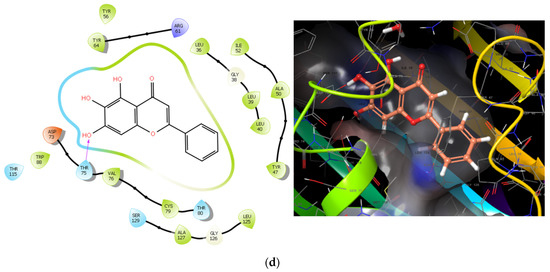 Baicalin and protein binding poses: (a)—multidrug exporter MexB 2V50; (b)—Sars-CoV protease8CZX; (c)—PQSE enzyme 7KGX; (d)—transcriptional activator protein PDB code 4NG2.