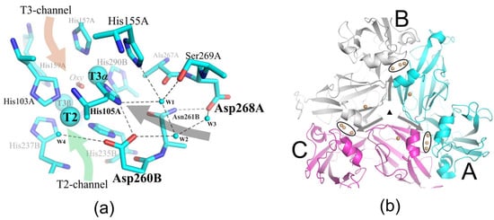 (a) The position and contacts of Asn268 in the SgfSLwt structure (PDB id 6S0O). Amino acid residues are shown in cyan. Copper ions are indicated as large cyan spheres. Dark dashed lines show hydrogen bonds. Small cyan spheres represent water molecules. The green and red arrows denote T2 and T3 channels, respectively; the dark gray arrow shows the proposed additional channel leading from the central cavity of SgfSL to TNC. (b) The trimer of SgfSL. Copper ions are shown as brown spheres and TNC copper ions are circled. The triangle in the middle represents the symmetry operator for trimer, whereas the arrows stand for the proposed route of the protons from the central cavity of SgfSL to TNC. A, B, and C in (b) denote the different chains.