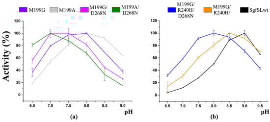 The effect of pH on laccase activity with 2,6-DMP as a substrate. (a) pH activity profile of M199G, M199A, M199G/D268N, and M199A/D268N mutant forms. (b) pH activity profile of SgfSLwt, M199G/R240H/D268N, and M199G/R240H mutant forms. The colors of the curves correspond to the colors from the plot legend. The data for the SgfSLwt, M199G, M199A, and M199G/R240H pH activity profile are taken from our previously published work [40].