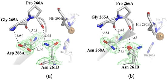 Not only subtle side chain mobility was detected in the mutant structure. It was found that Asp268Asn substitution led to reorganizing the network of hydrogen bonds, which through water molecules W1–W3 bound Asp268 with Asp260 (Figure 4a). In the structure of the wild-type enzyme, Asn261 was unable to interact with anything but Asp268 (Figure 3a and Figure 4b). However, in the structure of the Met199Ala/Asp268Asn mutant, the geometry of the NH2 group of the alternative conformation of Asn261 allowed this residue to form hydrogen bonds with water molecules W2 and W3 (Figure 4a). These new hydrogen bonds allowed Asn261 to be involved not only in the creation of electrostatic potential, but also in proton transfer to the TNC via the water following from the central trimer cavity to Asp260. Most likely, the observed hydrogen bonds’ net reorganization and electrostatic potential changes of the TNC copper ions’ environment (due to NH2–C=O group rotation) led to the pHopt shift of 2,6-DMP oxidation by the double mutants Met199Ala/Asp268Asn and Met199Gly/Asp268Asn, since other changes were not determined in the structure of the Met199Ala/Asp268Asn mutant form. At the same time, the pHopt of ABTS oxidation did not change since this substrate is oxidized under proton-rich environmental conditions (pH = 4). Based on this, there arises the assumption that Asn261 and Asp268 are proton donors/acceptors and can affect the gradient of proton transfer to T2 and T3α copper ions of TNC SgfSL.