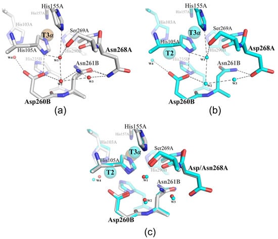 These hydrogen bonds fix the position of the Asn261 side group; as a result, the C=O group is turned towards the TNC copper ions (Figure 3a). Nevertheless, the C=O group of Asn261 does not have H-bonds with water molecules or histidines, coordinating TNC copper ions, and therefore cannot be involved in proton transfer, but it definitely creates electrostatic potential in the SgfSL TNC copper environment (Figure 3a). To summarize, in the SgfSLwt structure, Asp268 might be involved in proton transfer via the W1–W3 water chain localized in the channel leading from the central cavity of the SgfSL trimer to His105, and it indirectly controls the electrostatic potential of the TNC via the coordination of Asn261.
