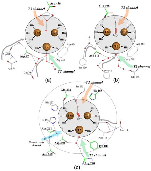 Regarding the investigation of the catalytic mechanism of laccases [3,4,31,32,33,34,35], it should be briefly summarized that the oxidation of the substrate takes place in the substrate-binding pocket, which is mainly localized near copper T1, coordinated by three residues (two His and Cys). The electrons from the substrate are transferred via the His–Cys–His pathway to the TNC, which is formed of one T2 copper ion and two T3 copper ions (T3α and T3β). In the TNC, the reduction of O2 to two H2O occurs. This process is carried out in two stages and requires four electrons and four protons, which are transferred from T1 and charged residues, located close to the TNC. It is proposed that oxygen penetrates to the TNC via the T3 channel, whereas protons are transferred to copper ions from charged residues localized in a T2 channel. The charged residues involved in proton transfer in 3D laccases are conservative “Asp” (located in a T2 channel) and semiconservative among bacterial and fungal laccases “Asp/Glu” (located in a T3 channel). Thus, laccases catalyze two reactions at once: the oxidation of substrates in the T1 center and the reduction of oxygen in the TNC.