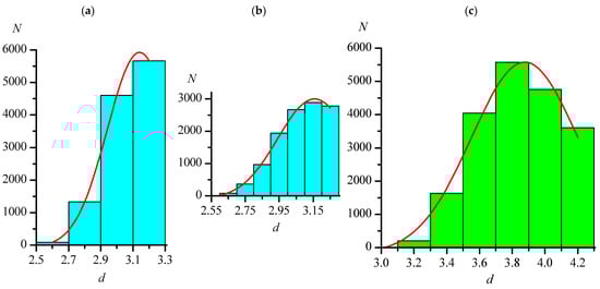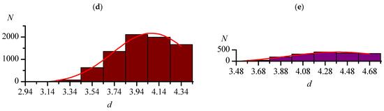 The maxima on all histograms were described by Gaussian function (red lines in Figure 1 and Figure 2). It should be noted that, when the histogram step changes, the view of histogram changes to some extent (for example, Figure 1a,b shows the distributions of the F...F distances with steps of 0.2 and 0.1 Å), but the position of the maximum when described by the Gaussian function remains almost constant (see Table 4 and Table 5). In Figure 1a, the position and the very presence of the maximum do not seem obvious, which, as noted earlier, is most likely a consequence of the initially chosen Ragg value for the F...F distances being underestimated. Therefore, additional arrays with dmax = 3.50 Å were analyzed for this type of distance. Table 4 shows that, in this case, as for other types of distances, the distribution parameters depend very little on the histogram step.
