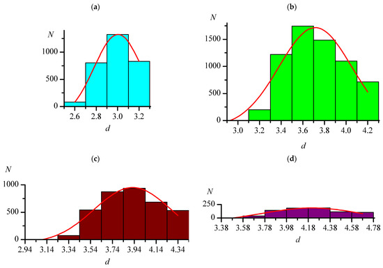 Distributions of the lengths (d, Å) of the shortest intermolecular distances C–Hal...Hal–C (one of each substance) in crystals of the Org set: F...F (a), Cl...Cl (b), Br...Br (c), I...I (d). The red lines are the approximations by the Gaussian function.