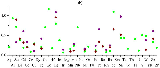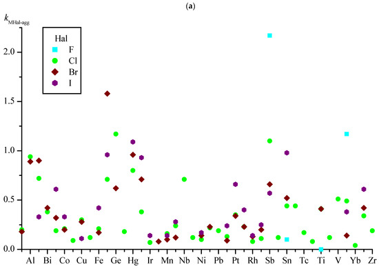 Obviously, the kMHal-agg coefficient has a predictive value if the number of symmetrically independent M–Hal bonds in the training set is sufficiently large. The smallest numbers of such bonds were found for the M–F groups; therefore, the NM–Hal boundaries in the analysis of kMHal-agg were chosen, considering the available NM–F. The graphs illustrating the changes in kMHal-agg depending on M and Hal show values for metals having more than 20 symmetrically independent M–Hal bonds in the set (Figure 3a) and more than 40 bonds (Figure 3b) (for convenience, the abscissa scales on Figure 3a,b are made identical; elements M are listed in alphabetical order).