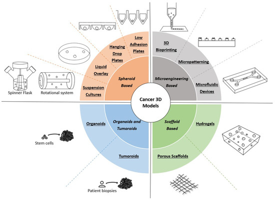 Types of 3D models used in cancer research. Spheroid-based models promote the formation of spheroids through the self-assembly of tumor cells using several methodologies, such as medium agitation or culture in nonadherent conditions. Microengineering-based models implement micro- and nanotechnologies to obtain systems that allow for precisely controlling important variables. Scaffold-based models rely on biomaterials to produce a structure that mimics the in vivo ECM, which is used to support cancer cell growth and proliferation. Organoids and tumoroids are in vitro self-assembling aggregates derived from stem cells and patient biopsies, respectively, allowing for obtaining models with more than one cell type.