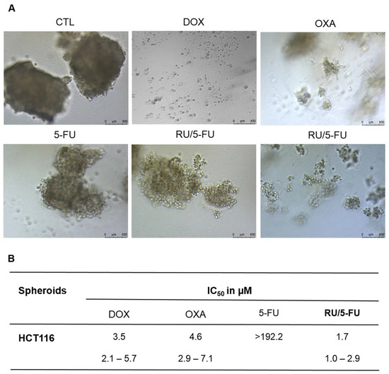 [Ru(5-FU)(PPh3)2(bipy)]PF6 (RU/5-FU) effect on HCT116 spheroids. (A) Spheroids observed using light microscopy after incubation with the compounds. (B) IC50 values in µM and their respective 95% confidence intervals from three separate experiments completed in duplicate, evaluated using the alamar blue test 72 h after incubation with the compounds. The negative control (CTL) was incubated with DMSO. The positive controls comprised doxorubicin (DOX), oxaliplatin (OXA), and 5-fluorouracil (5-FU) [71].