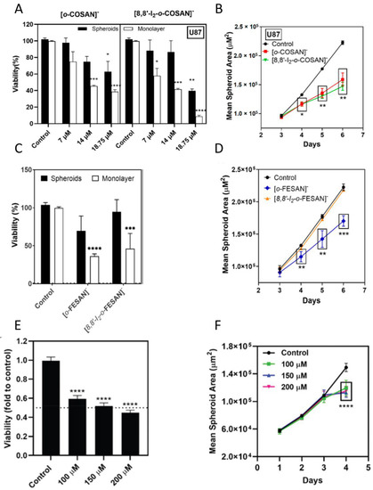 Effects of metallacarboranes in glioblastoma spheroids. (A) Viability of spheroids and monolayer-grown cells 72 h after incubation with [o-COSAN]− and [8,8′-I2-o-COSAN]−, determined by the APH test. (B) Spheroid growth, given by the mean spheroid area as a function of culture time, after incubation with [o-COSAN]− and [8,8′-I2-o-COSAN]−. (C) Viability of spheroids and monolayer-grown cells 72 h after incubation with [o-FESAN]− and [8,8′-I2-o-FESAN]−, determined by the APH test. (D) Spheroid growth, given by the mean spheroid area as the function of culture time, after incubation with [o-FESAN]− and [8,8′-I2-o-FESAN]−. (E) Viability of spheroids 24 h after incubation with Na[o-57FESAN]−, determined by the CellTiter-Glo® 3D Cell Viability Assay. (F) Spheroid growth, given by the mean spheroid area in function of culture time, after incubation with Na[o-57FESAN]. Spheroids or monolayer cultures treated only with the medium were used as the controls. Statistical significance was calculated using one-way ANOVA, followed by Dunnett’s test comparing treated spheroids/cells with control spheroids/cells (* p ≤ 0.05, ** p ≤ 0.01, *** p ≤ 0.001, and **** p ≤ 0.0001). Adapted from [70,73,179].