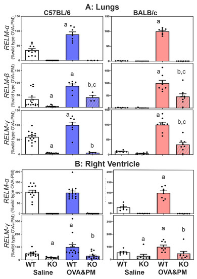 The RELMα−/− mice that we studied also had significantly decreased RELMβ and RELMγ mRNA expression in the lungs and right ventricle. Therefore, our study indicates a critical role of these mediators in BALB/c mice for the responses to antigen and PM2.5, while they were redundant in C57BL/6 mice. The strain difference could be due to differences in the responsiveness of the pulmonary vasculature to proliferative and constrictive cues. In this respect, it is remarkable that C57BL/6 mice have polymorphisms (SNPs) in the 3-prime region of the BMPR2 (bone morphogenetic protein receptor, type II) gene that are not found in BALB/c mice (https://www.informatics.jax.org/snp/marker/MGI:1095407; accessed on 15 May 2023). Decreased function of the BMPR2 gene is associated with a high risk of developing pulmonary hypertension [45]. Another possibility is that potential receptors for the RELM molecules, such as Toll-like receptor (TLR4) or RAGE (advanced glycosylation end-product) [46,47], are polymorphic and differ between C57BL/6 and BALB/c mice. There is strong evidence that resistin binds TLR4 [48,49]; however, little is known about the binding of RELM molecules to TLR4. Further, TLR4 is polymorphic between BALB/c and C57BL/6 mice [50], and this is particularly important because the antigen (OVA) that we used contains lipopolysaccharide, which induces inflammation via TLR4. The RAGE gene is located in the MHC locus, H2K, and this locus is highly polymorphic between BALB/c (H2Kd) and C57BL/6 (H2Kb) mice.
