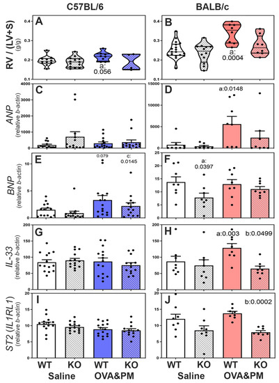 Right ventricular responses in C57BL/6 strain (A,C,E,G,I) and BALB/c (B,D,F,H,J) strain WT and RELMα KO mice measured by right ventricular weight (RV/LV + S) × 100 (A,B) and expression of mRNA of mediators that reflect RV stress (natriuretic peptide type A-ANP, or type B-BNP, IL-33, ST2-IL1RL1-IL-33 receptor). Violin plots (A,B) show individual data points and data distribution. Bars (C–J) show means, SEM and individual data points. (C–J): CT values were calculated relative to beta-actin (×1000). Pairwise comparisons were with the independent, 2-tailed Mann–Whitney test; p < 0.05 for comparison with (a) WT-Saline, (b) WT-OVA&PM and (c) KO-Saline.